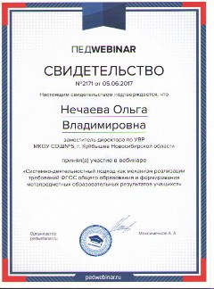 участие в вебинаре "Системно-деятельностный подход как механизм реализации требований ФГОС общего образования и формирования метапредметных результатов учащихся", 2017г.