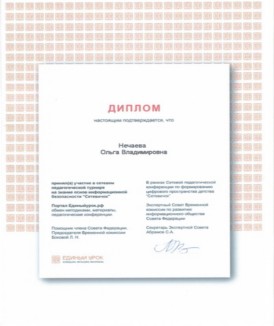 май 2012 года - диплом участника и благодарственное письмо за активное содействие в проведении и подготовку участников II Всероссийского (с международным участием) конкурса презентаций "ТопСлайд" май 2012 года - Благодарственное письмо организационного комитета Всероссийского дистанционного конкурса "Мир Знаний"