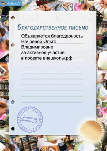 октябрь 2012 года - благодарность от учительского портала Внешколы за активное участие в проекте внешколы.рф