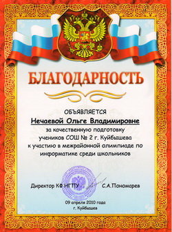 апрель 2011 года - благодарность директора КФ НГПУ за качественную подготовку учеников школы к участию в межрайонной олимпиаде по информатике среди школьников