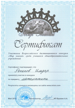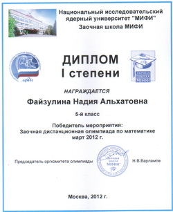 март - участие в конкурсе "Кенгуру-2012". Файзулина Надия, 5 класс - первое место в школе, второе место в районе, выполнив 94,72% заданий апрель - участие в III межрайонной олимпиаде школьников по информатике