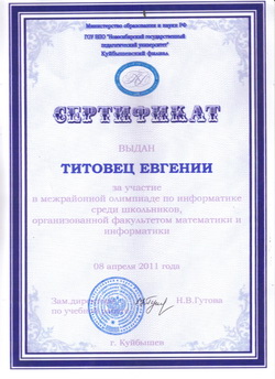 2011-2012 учебный год 14 октября прошел школьный этап Всероссийской олимпиады школьников по информатике: Еременко Савелий, 10 класс - призер (32 балла) Шамне Роза, 11 класс - победитель (70 баллов) 31 октября - участие в областной олимпиаде по мультимедийным технологиям Нагаев Василий, 11 класс - призер февраль - участие во Всероссийской олимпиаде школьников по информатике, проводимой Бийским центром поддержки талантливой молодежи Смирнова Евгения, 11 класс - 6 место Шамне Роза, 11 класс - 6 место Соловьева Татьяна, 11 класс - 8 место Мазунина Людмила, 10 класс - 6 место Еременко Савелий, 10 класс - 8 место Потапова Татьяна, 10 класс - 12 место март - участие в заочной олимпиаде по математике "Построй свое будущее", проводимой Национальным исследовательским ядерным университетом "МИФИ" и Заочной школой "МИФИ" Результаты: Бондарева Алина, 5 класс - победитель Файзулина Надия, 5 класс - победитель Руднева Ксения, 5 класс - призер